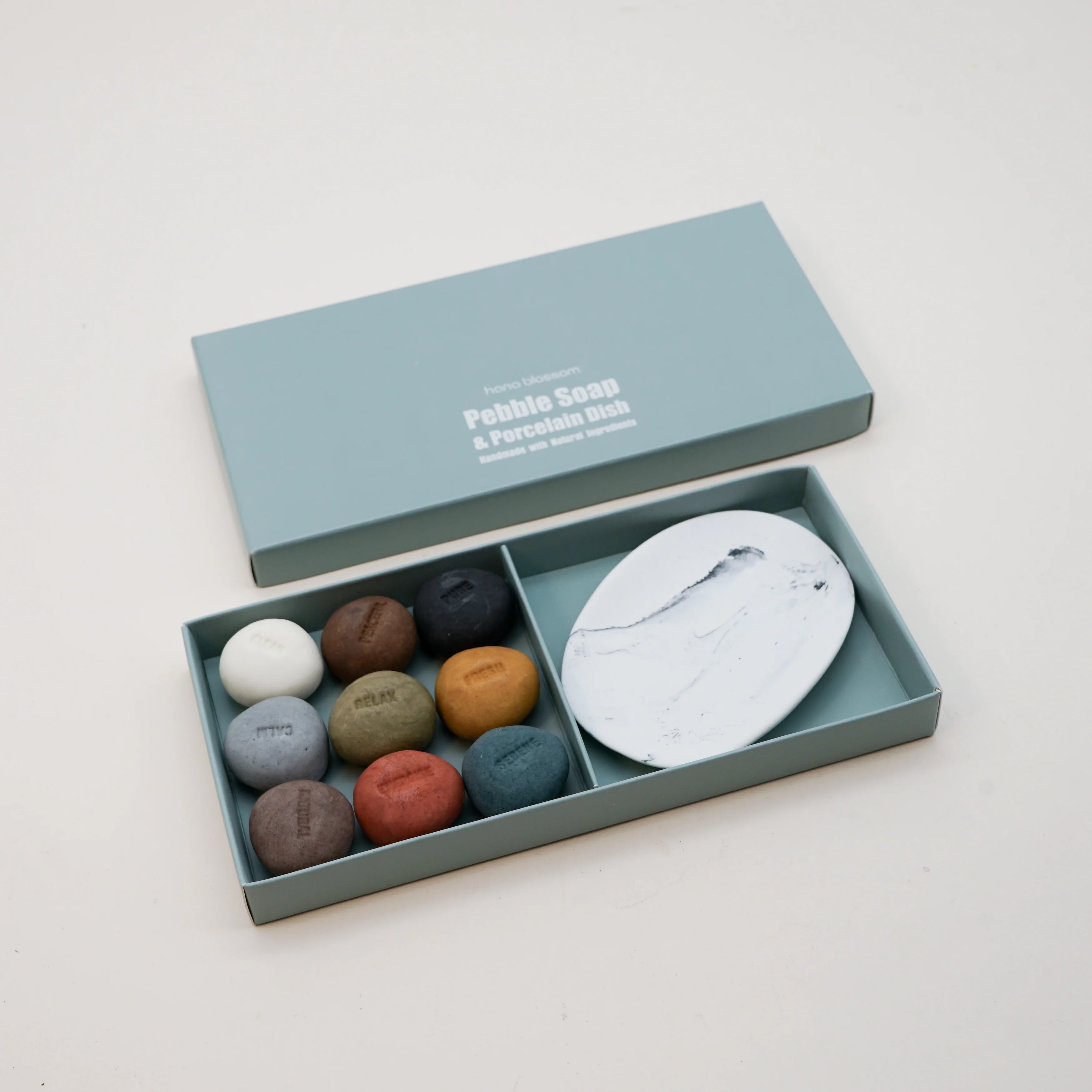 A set of 9 little pebble soaps with a small porcelain dish. The pebble soaps are engraved with mood wording such as 'calm', 'fresh', 'serene', and more. They're made with 100% natural ingredients, are vegan, cruelty free, and eco friendly.