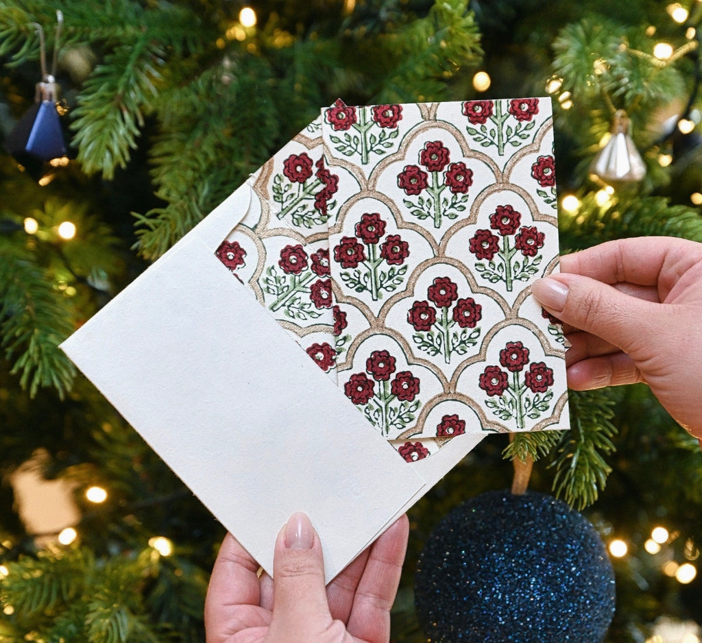 These beautiful card designs are expertly hand block printed by skilled craftsmen on 100% cotton cards.