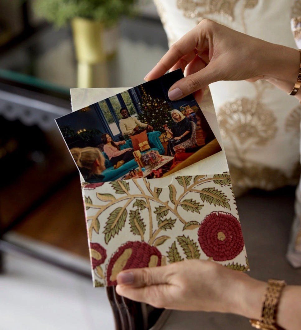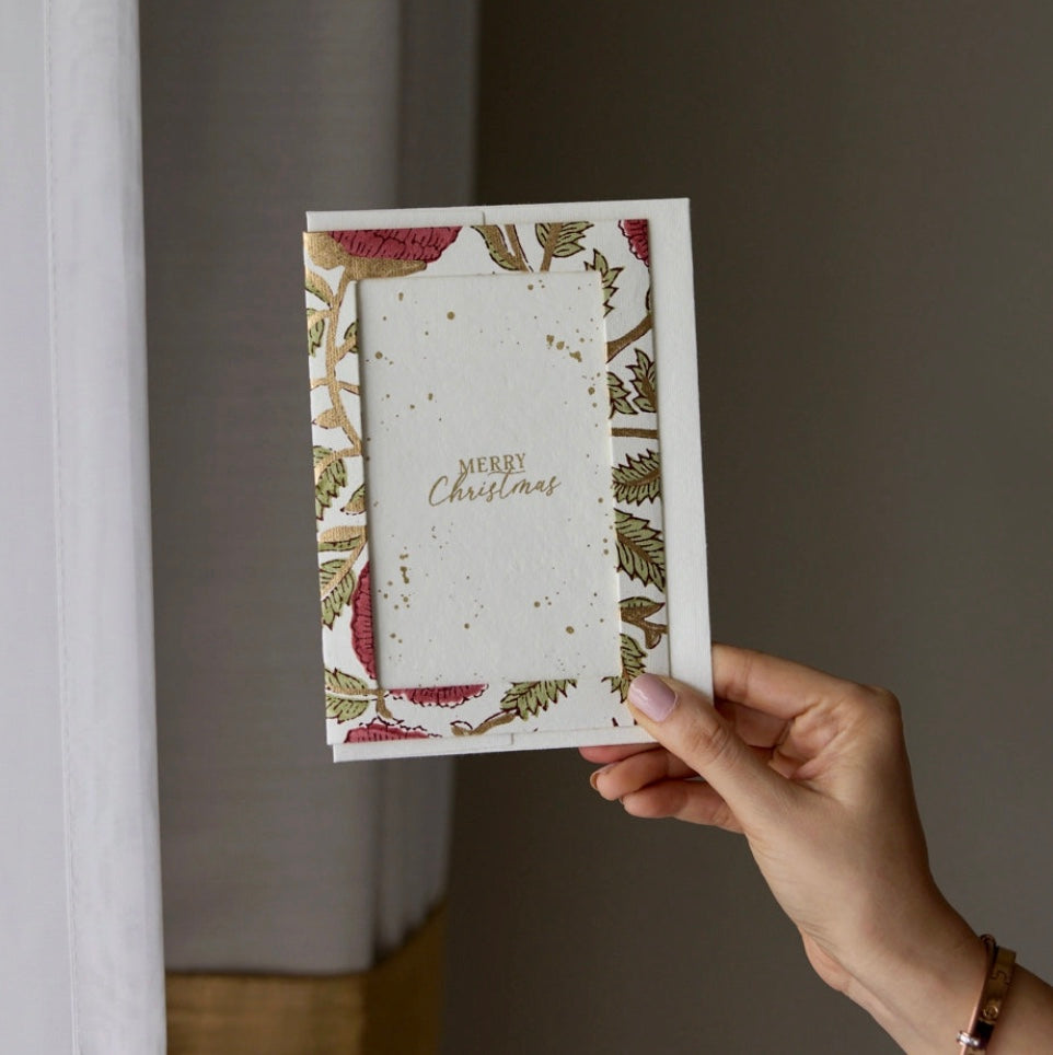 These beautiful card designs are expertly hand block printed by skilled craftsmen on 100% cotton paper.