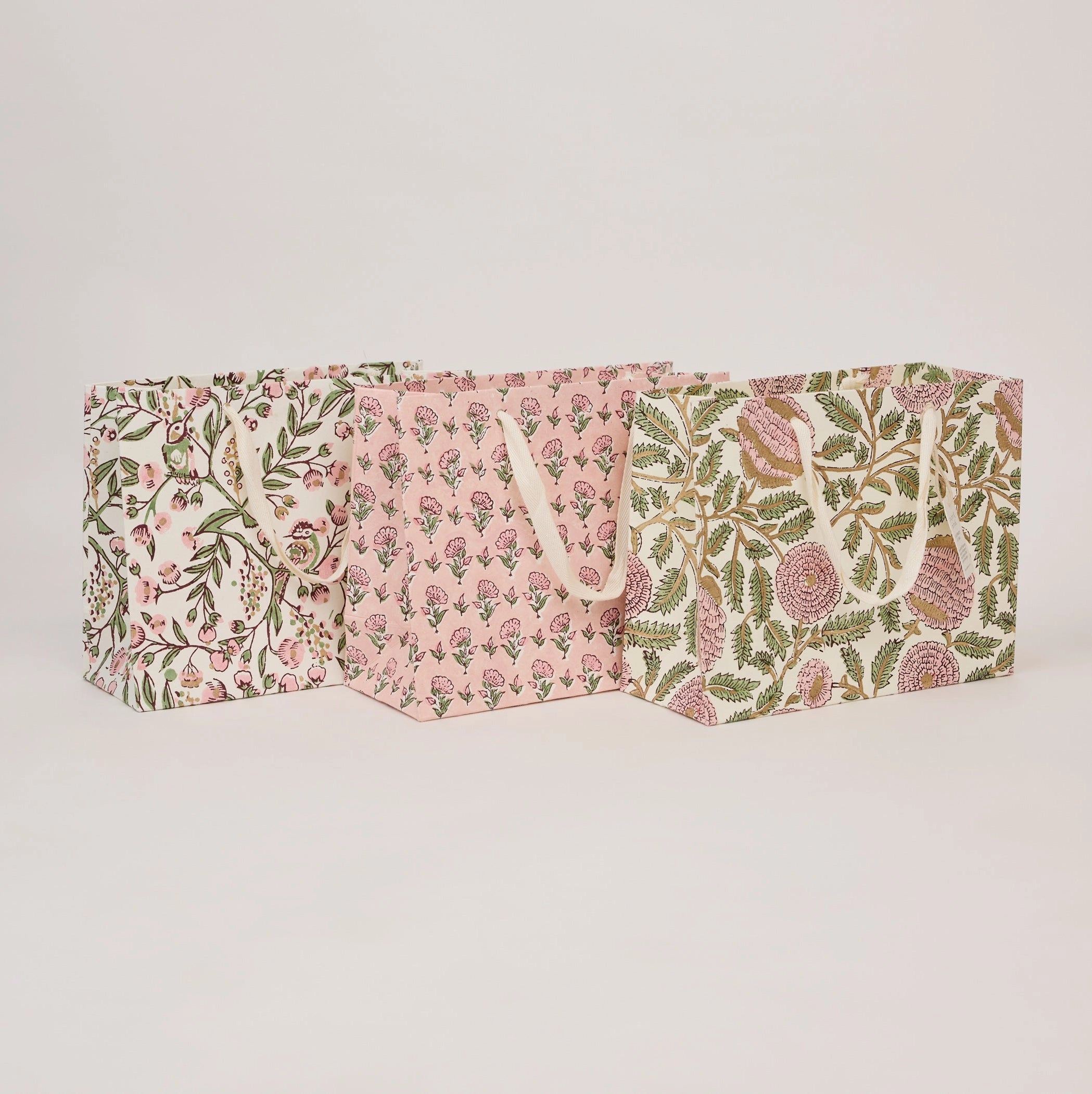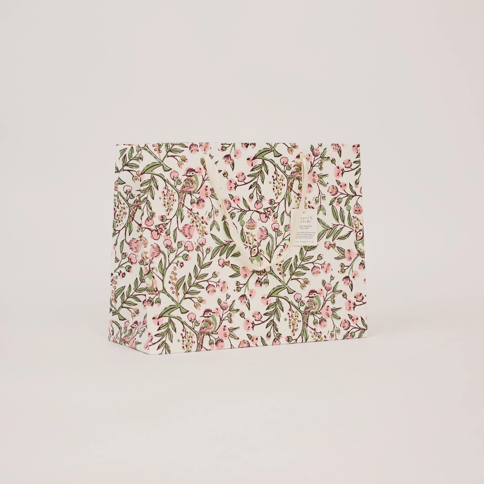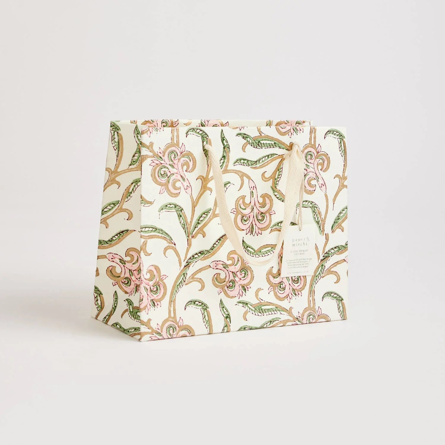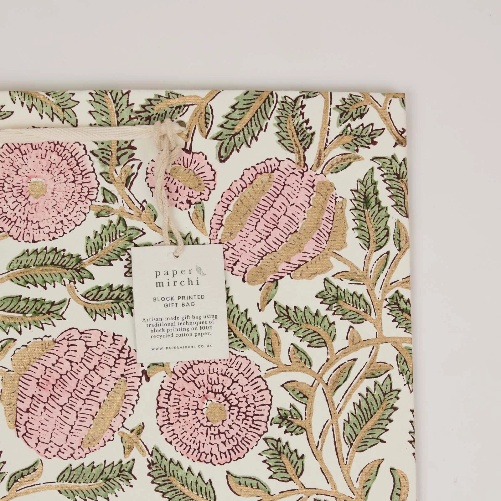 These luxurious gift bags are made in India from ivory cotton paper that has been carefully block-printed by hand. Beautiful repeat patterns are lined up perfectly and individually stamped, resulting in a bag that is every bit as special as the gift that's inside it!