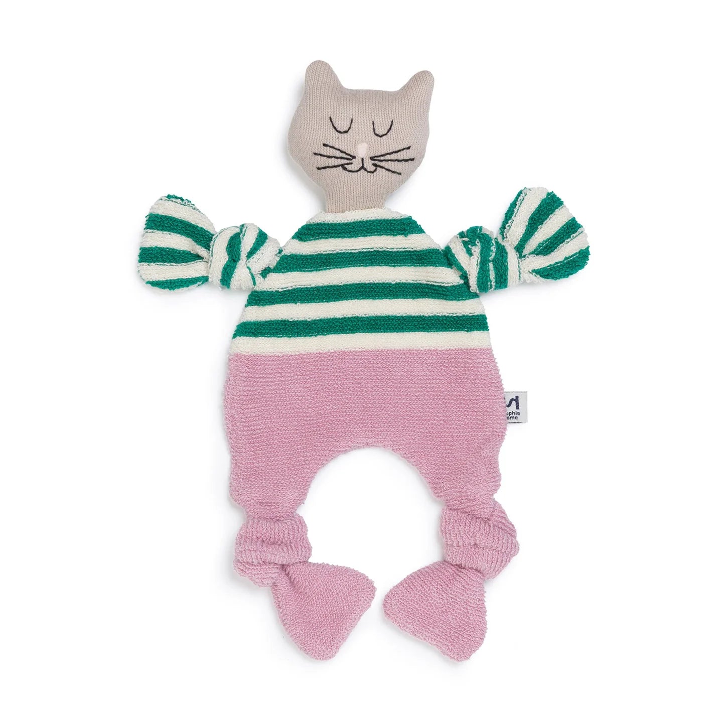 A contemporary cotton knit baby comforter with soft terry body and an embroidered cat face. Lightweight, tactile and easy for little hands to grasp - perfect for newborn gifting and everyday use.