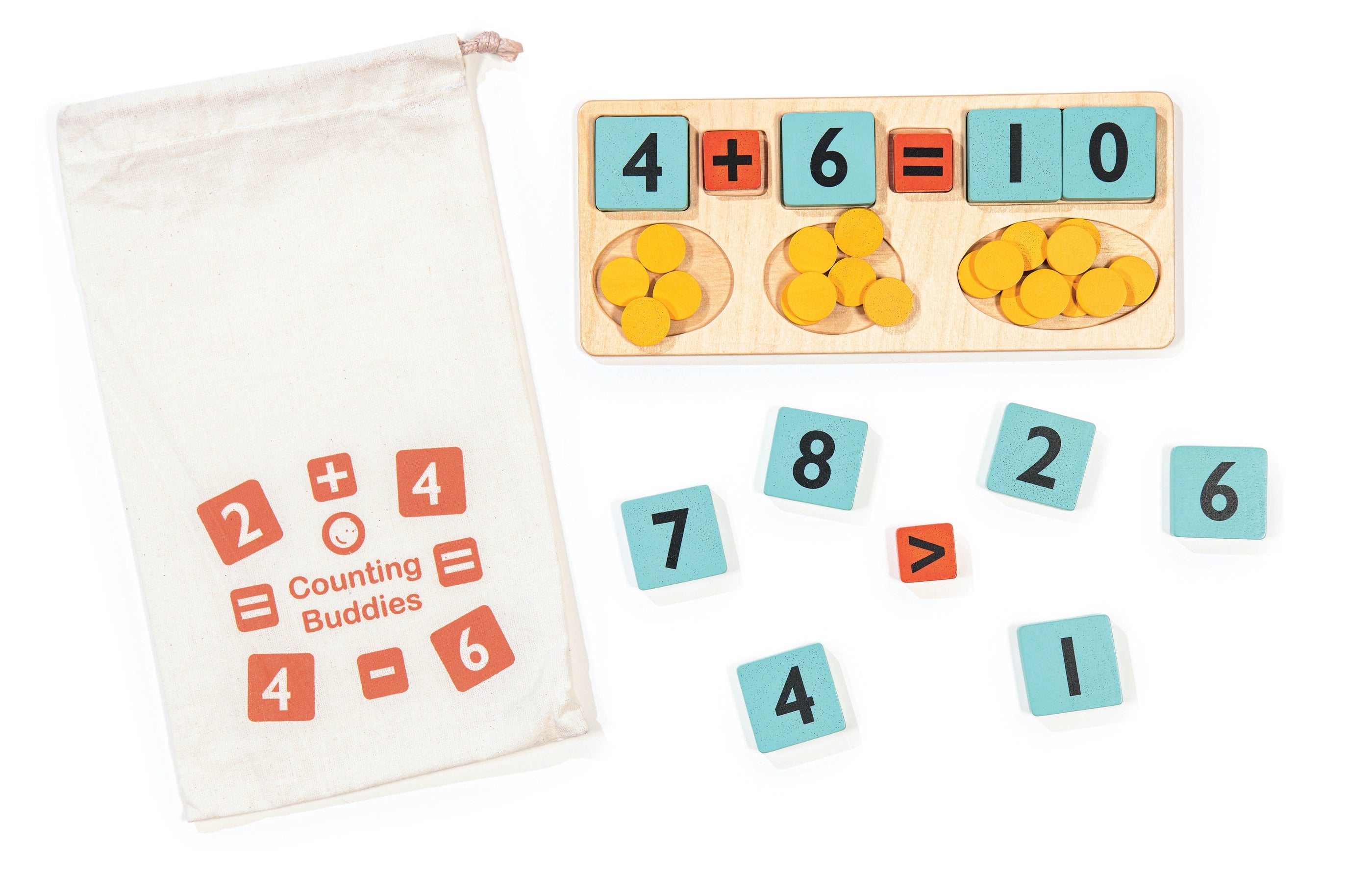 Explore the world of numbers and early learning counting with this wooden counting set from Mentari. Contains a plywood tray with indented shapes for the tiles and counters, along with 20 yellow wooden counters to count out to corresponding number tiles, an equal sign, a plus and minus, and a greater and less than symbols complete this simple yet effective numbers playset.