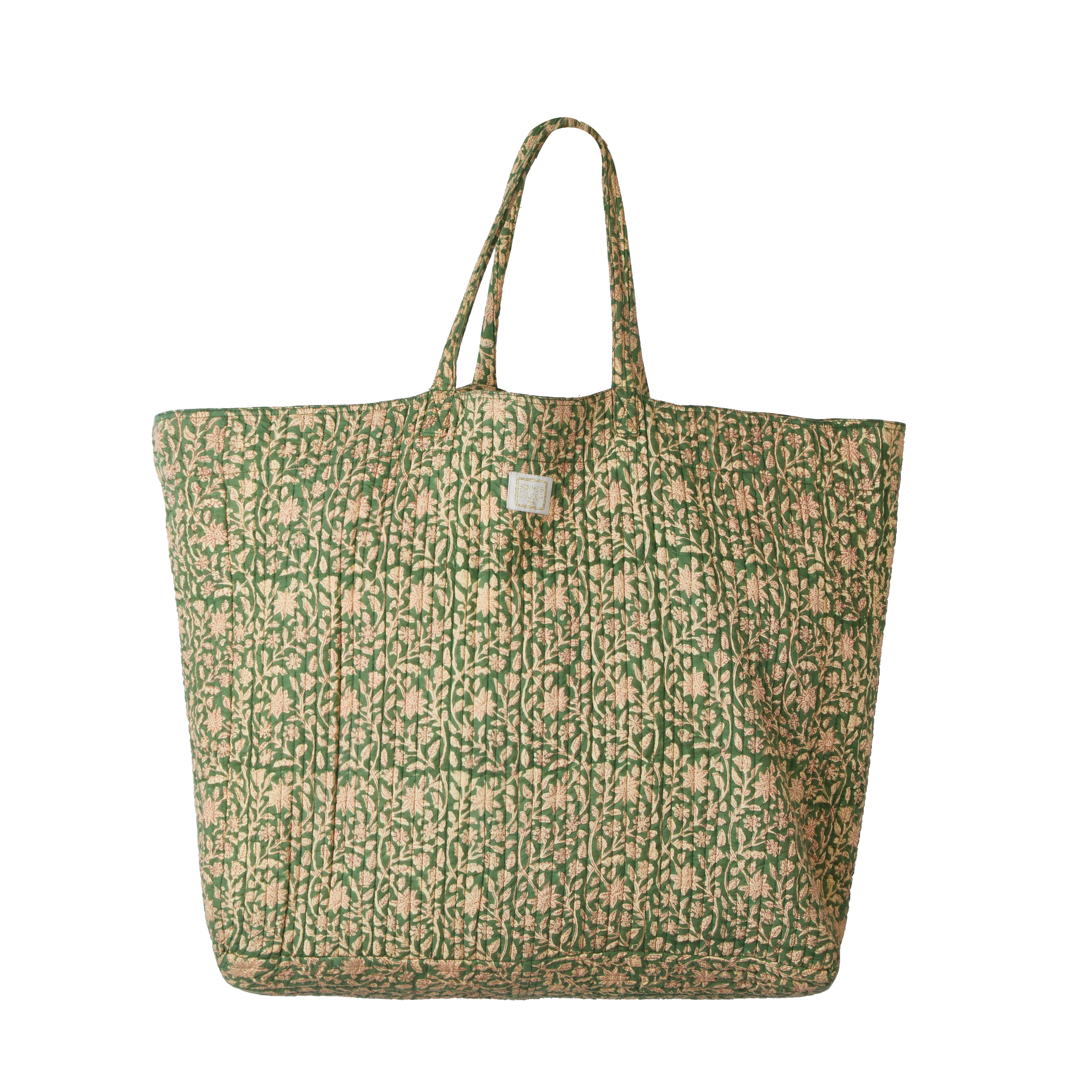Hand-printed using a traditional Indian block-print method, this generously sized quilted cotton tote is roomy enough for the beach, shopping trips or for weekends away! Long, padded handles make it a comfortable and easy to carry, even when filled to the brim.