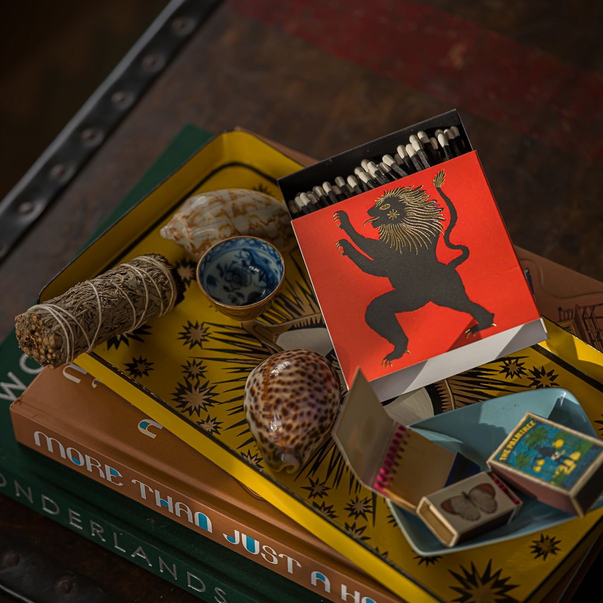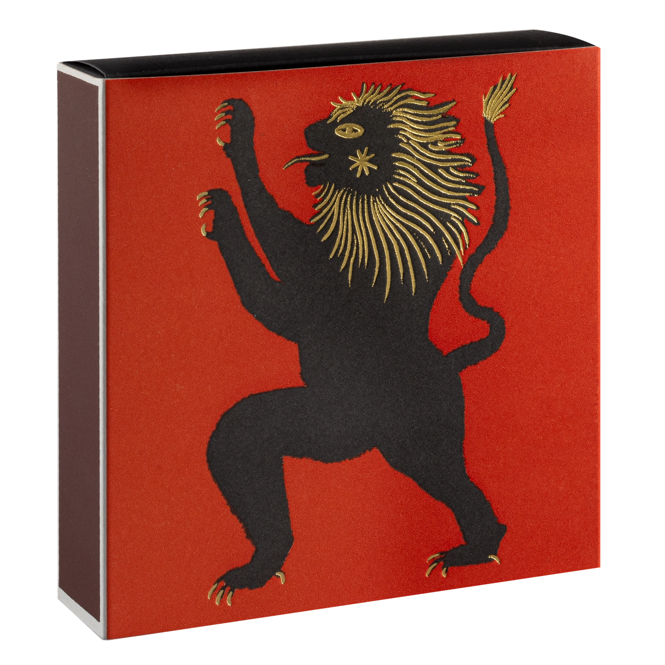 Archivist's signature square matchbox, featuring a roaring lion with gold foil detailing in its mane. Designed by Tabby Booth.