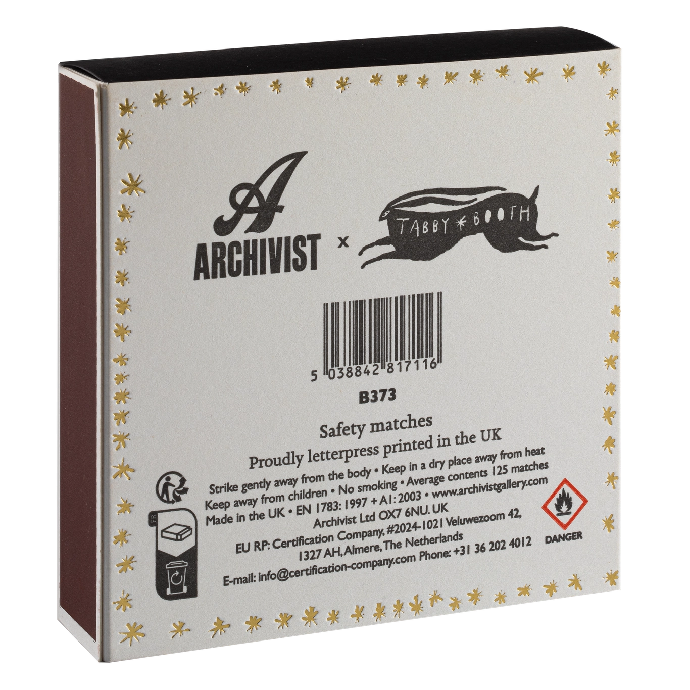 Archivist's signature square matchbox, featuring a brassy gold foil sun with an illustrated face and rosy red cheeks. Designed by Tabby Booth