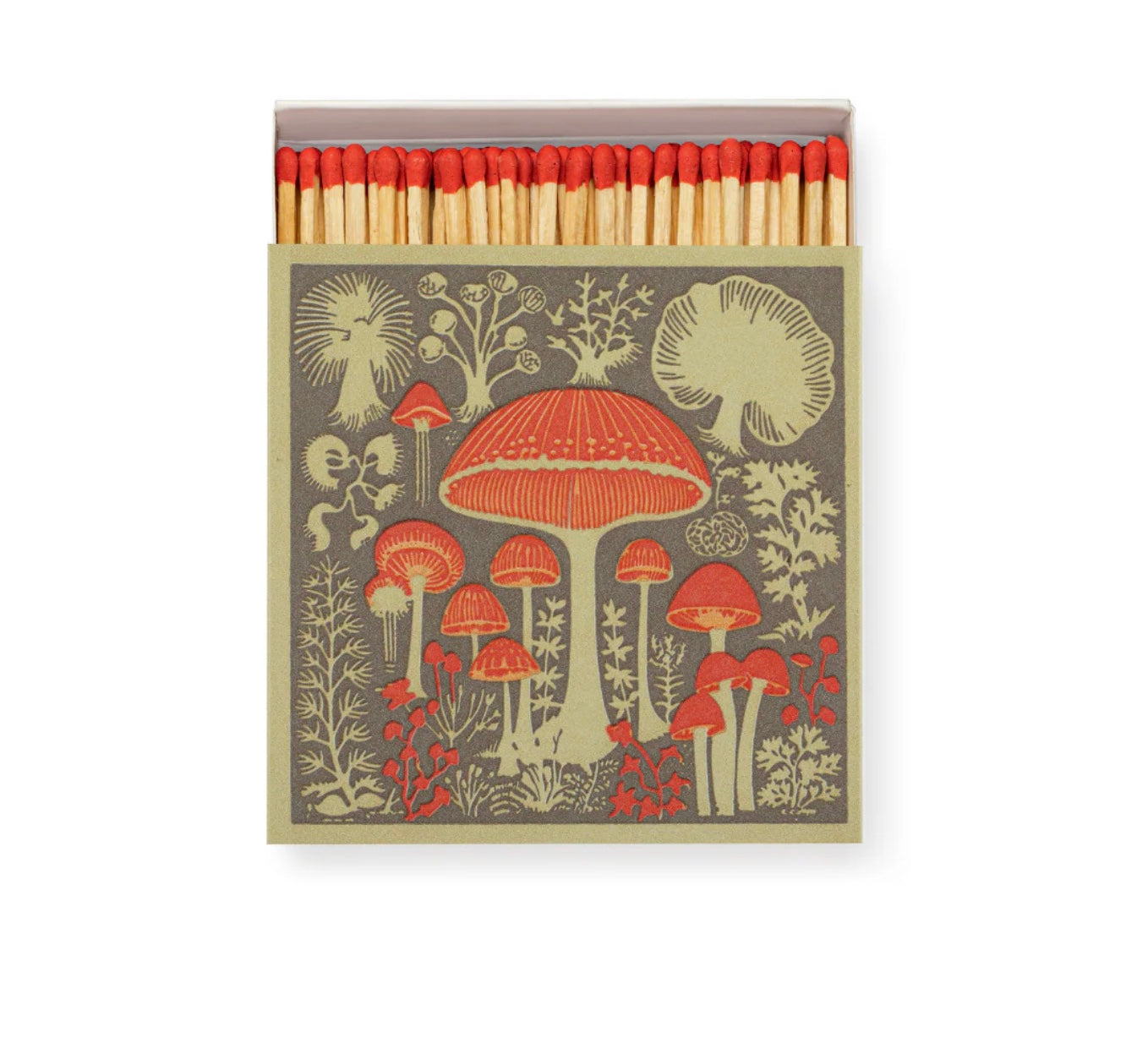 Our signature square matchbox featuring a selection of wild mushrooms.