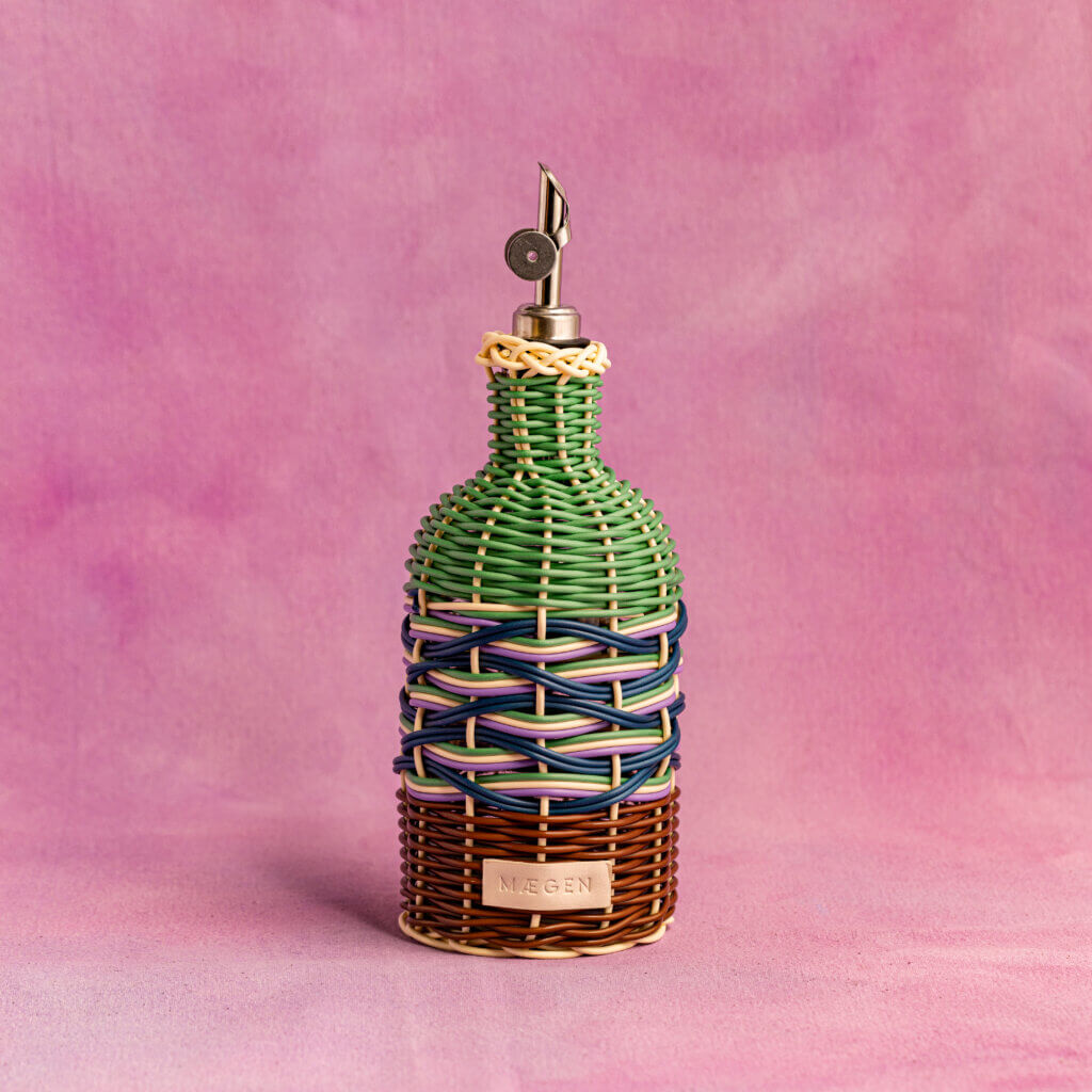 Wrapped in vibrant woven detail, this glass oil pourer, created by Maegan, turns a kitchen essential into a statement piece. Practical and easy to use with its stainless steel spout, it’s designed for smooth pouring at the table or while cooking. Durable, eye-catching, and versatile — it’s the kind of piece that looks as good on display as it works in use.