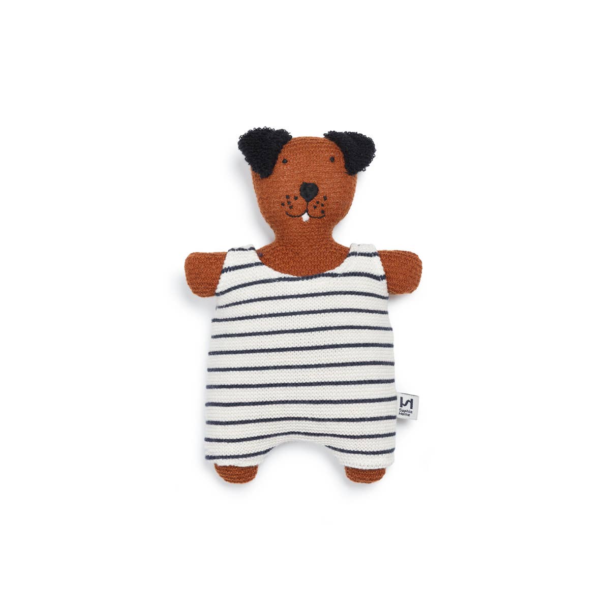 A charming soft toy dog from Sophie Home. With a textured cotton knit, featuring a striped navy romper, and a softly weighted bean-filled body, this is a perfect companion for a child of any age.