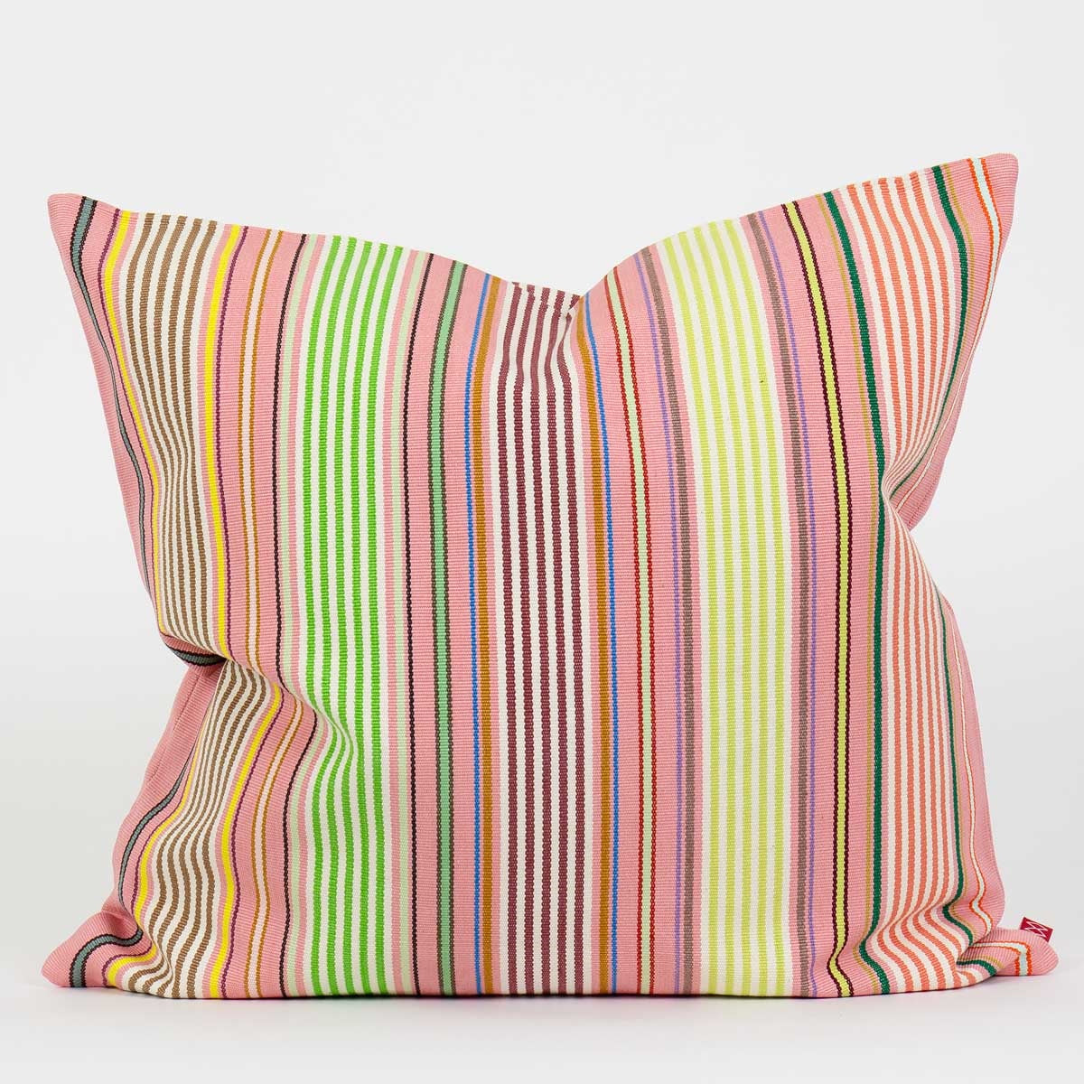 A vibrant and colourful Fairtrade cushion with a beautiful palette of vertical stripes. These striped fabrics are a collaboration between Mayan artisans in Guatemala and Swedish designers who aim to create jobs and keep the weaving tradition alive. The cover is a 100% heavyweight cotton fabric and is filled with a premium feather pad.
