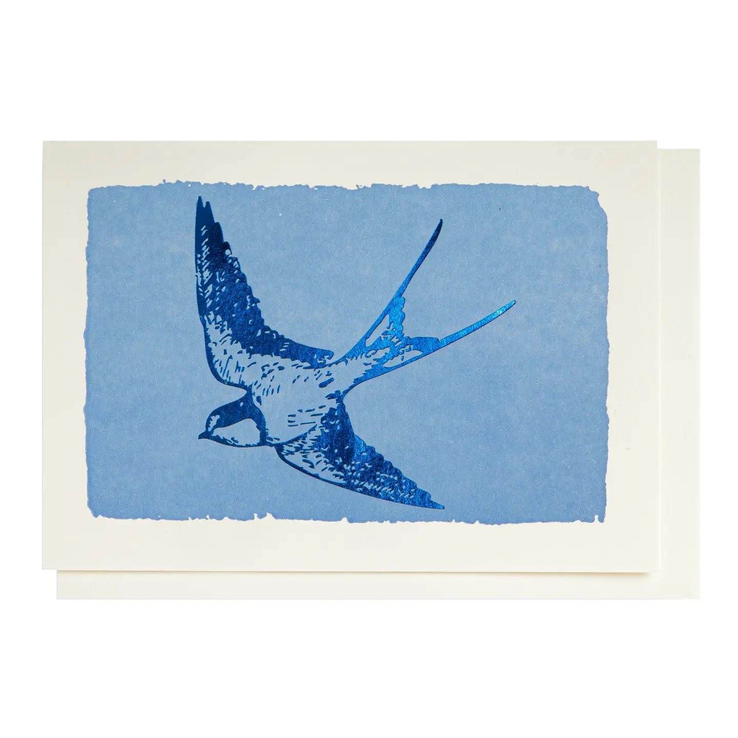 This pack of five blank cards features a simple swallow design in metallic blue.