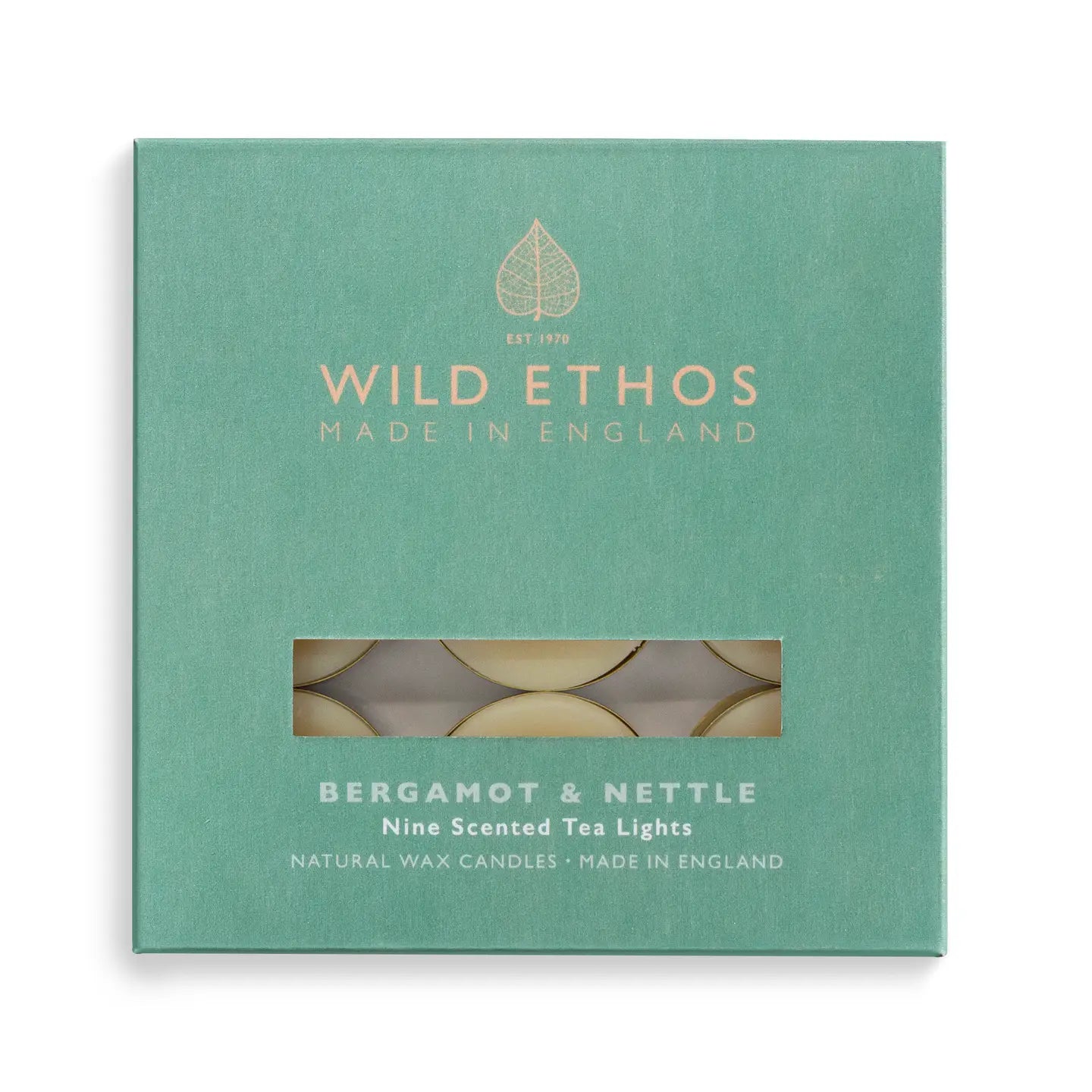 A box of nine bergamot and nettle scented tealights from Wild Ethos. An uplifting, invigorating, and fresh scent — with pressed bergamot and citrus notes intertwined with green nettle and cedarwood. Perfect for refreshing any space in which lit.