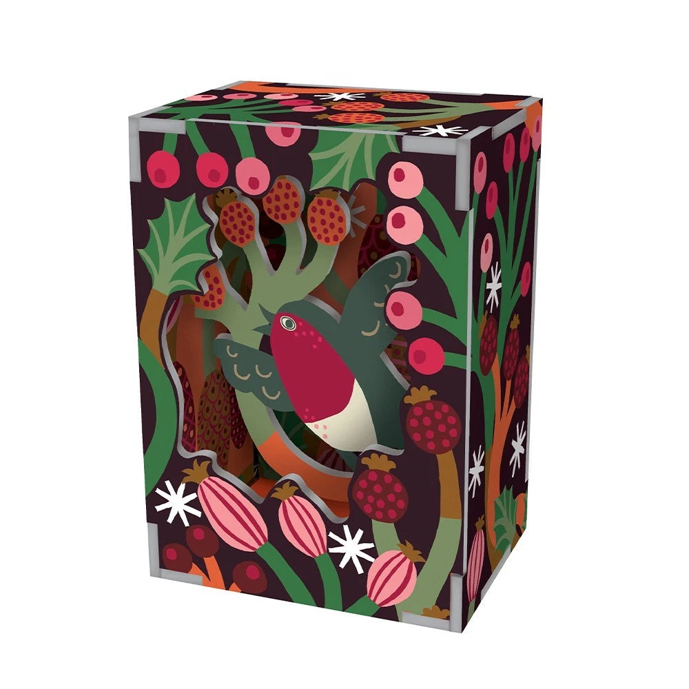This delightful pop and slot festive scene comes flat pack and creates a lovely boxed diorama with a robin inside. With easy to follow instructions, it's a lovely thing to make with little ones.