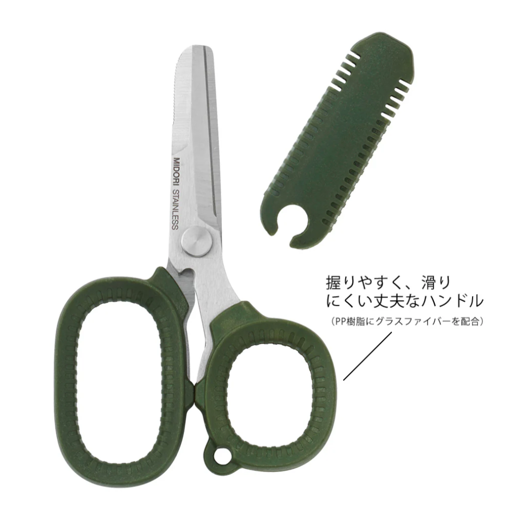 Theses Midori portable multi-scissors are a highly versatile and compact tool that can be used both indoors and outdoors. They feature a non-slip, generously sized handle, a serrated bottom edge for opening boxes, strong curved steel blades that make cutting through thick paper or credit cards easy, and a built-in wire cutter.