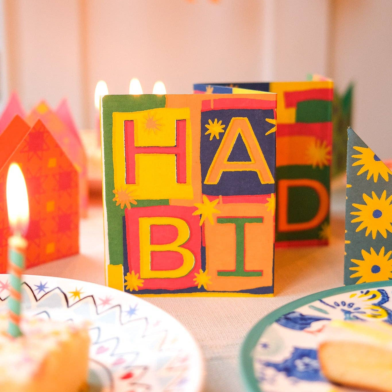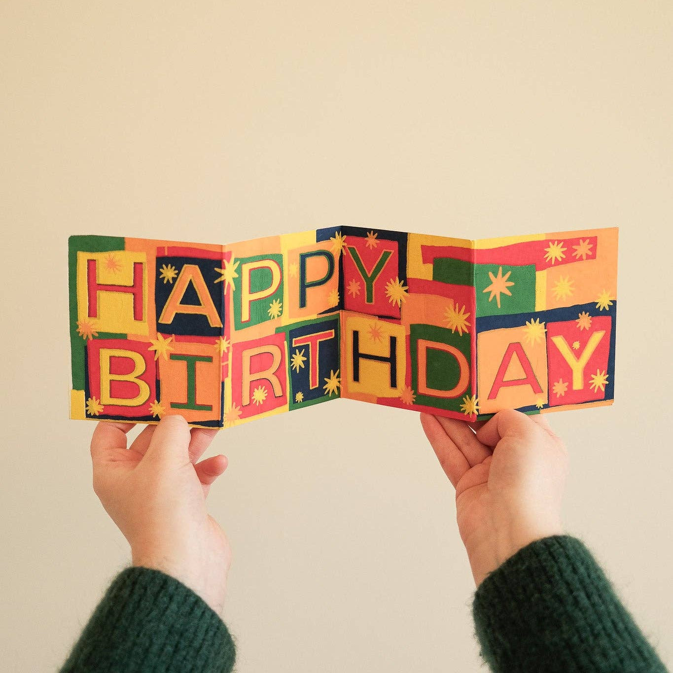 This vibrant concertina card unfolds with a burst of colour to reveal a cheerful Happy Birthday message with blank reverse for personalised message.