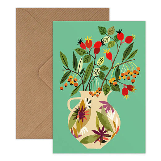 The card is printed on 100% recycled card. Blank inside and includes good quality brown kraft envelope, both are then packed in a clear cellophane envelope.