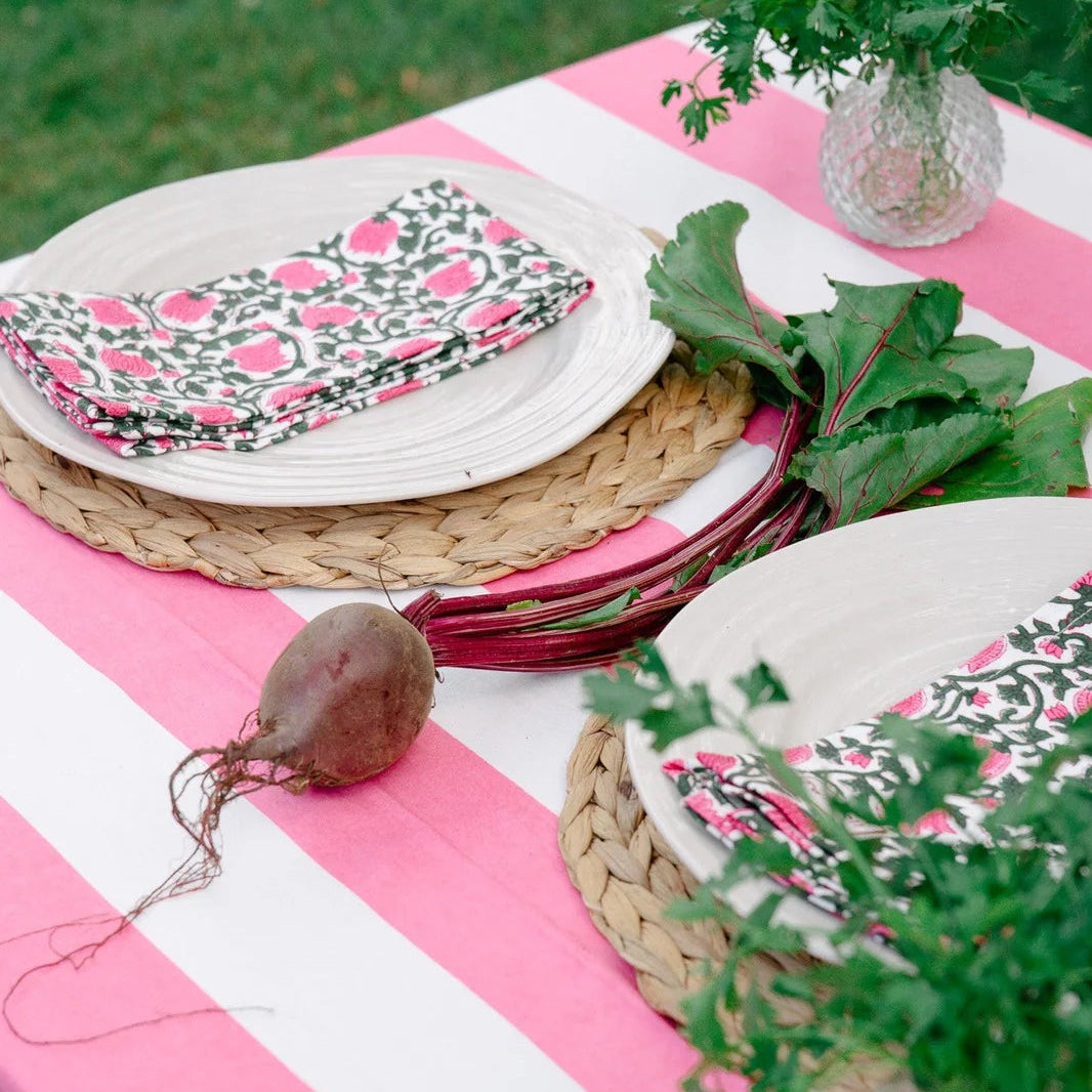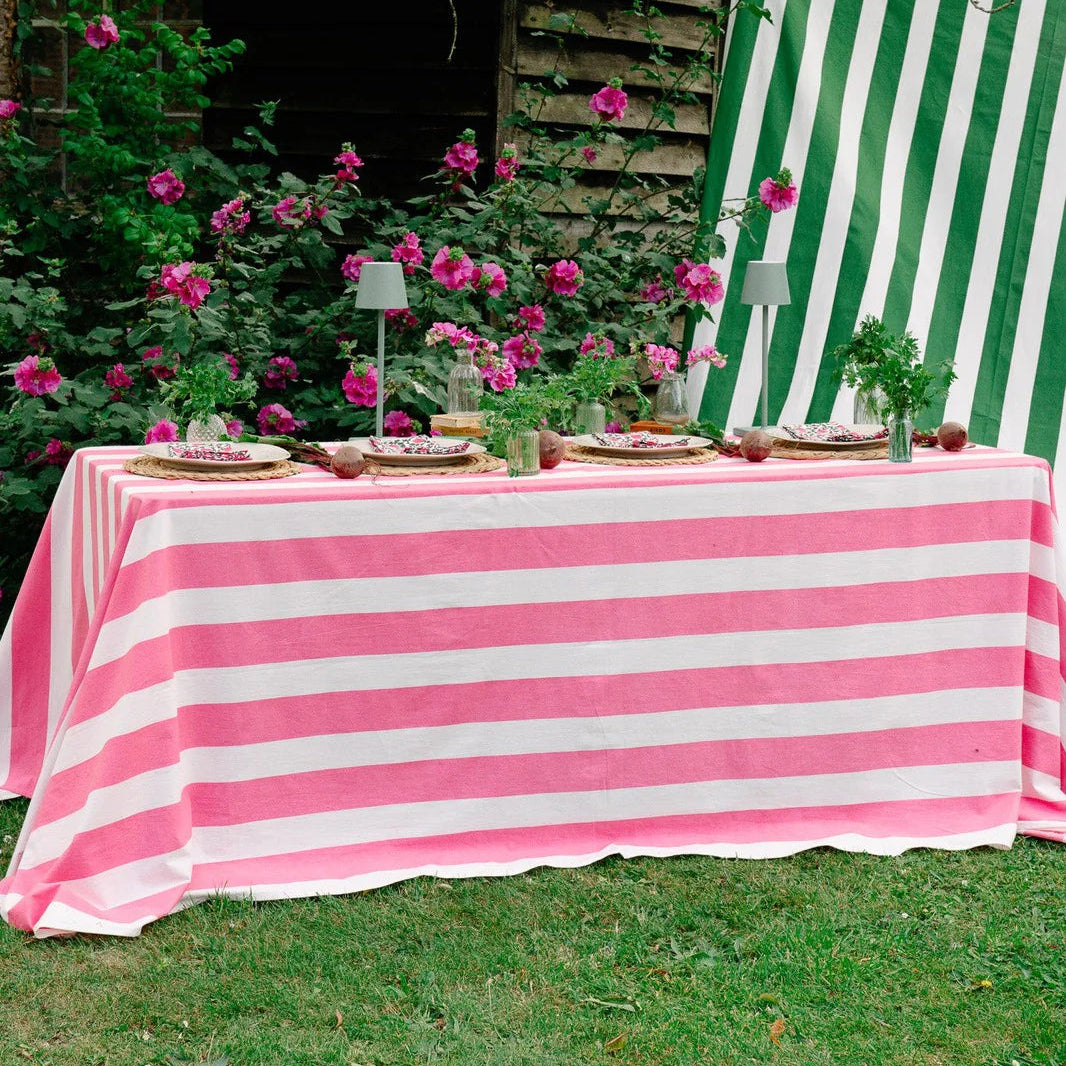 Each tablecloth is hand block printed in a classic wide stripe design. Perfect for larger gatherings and long tables.