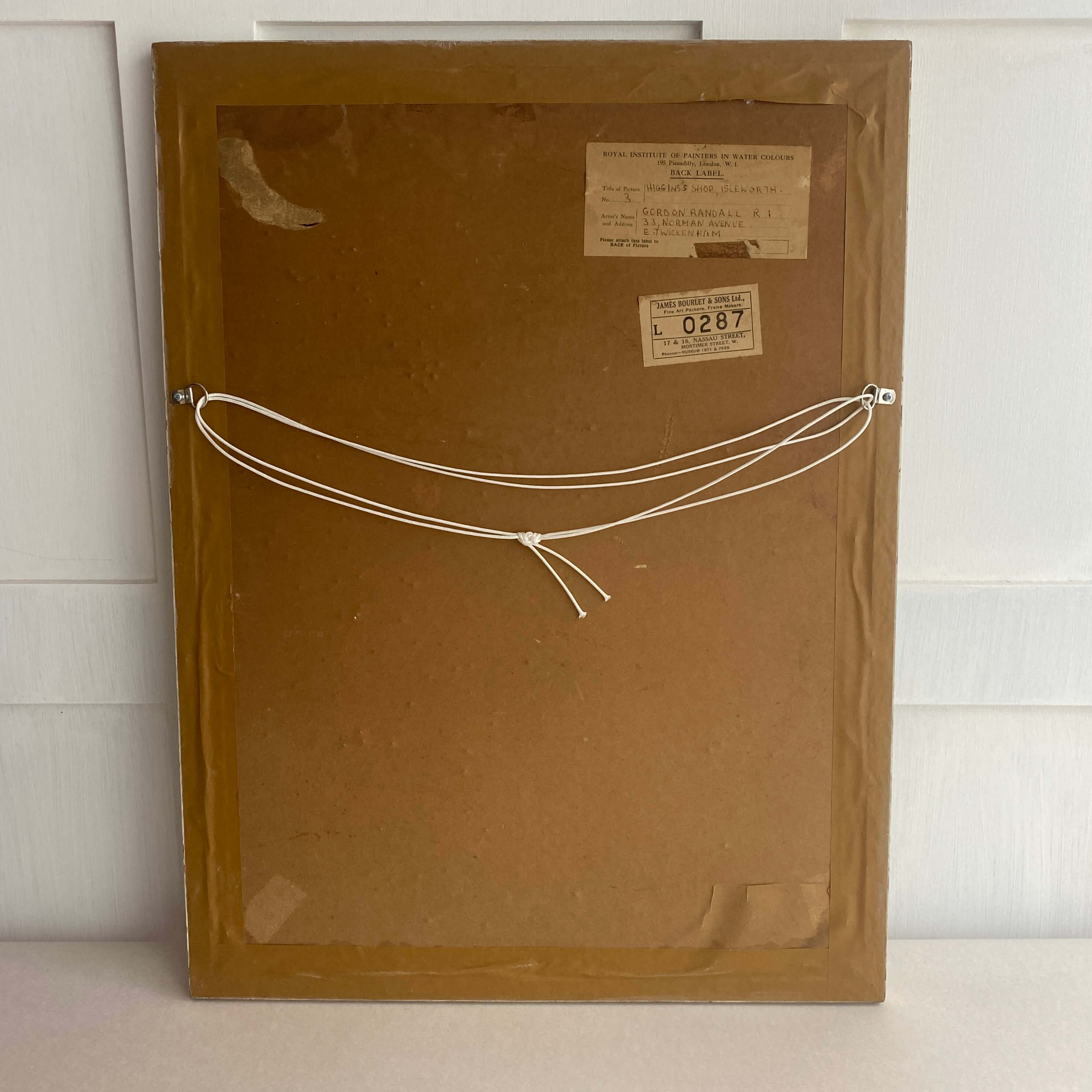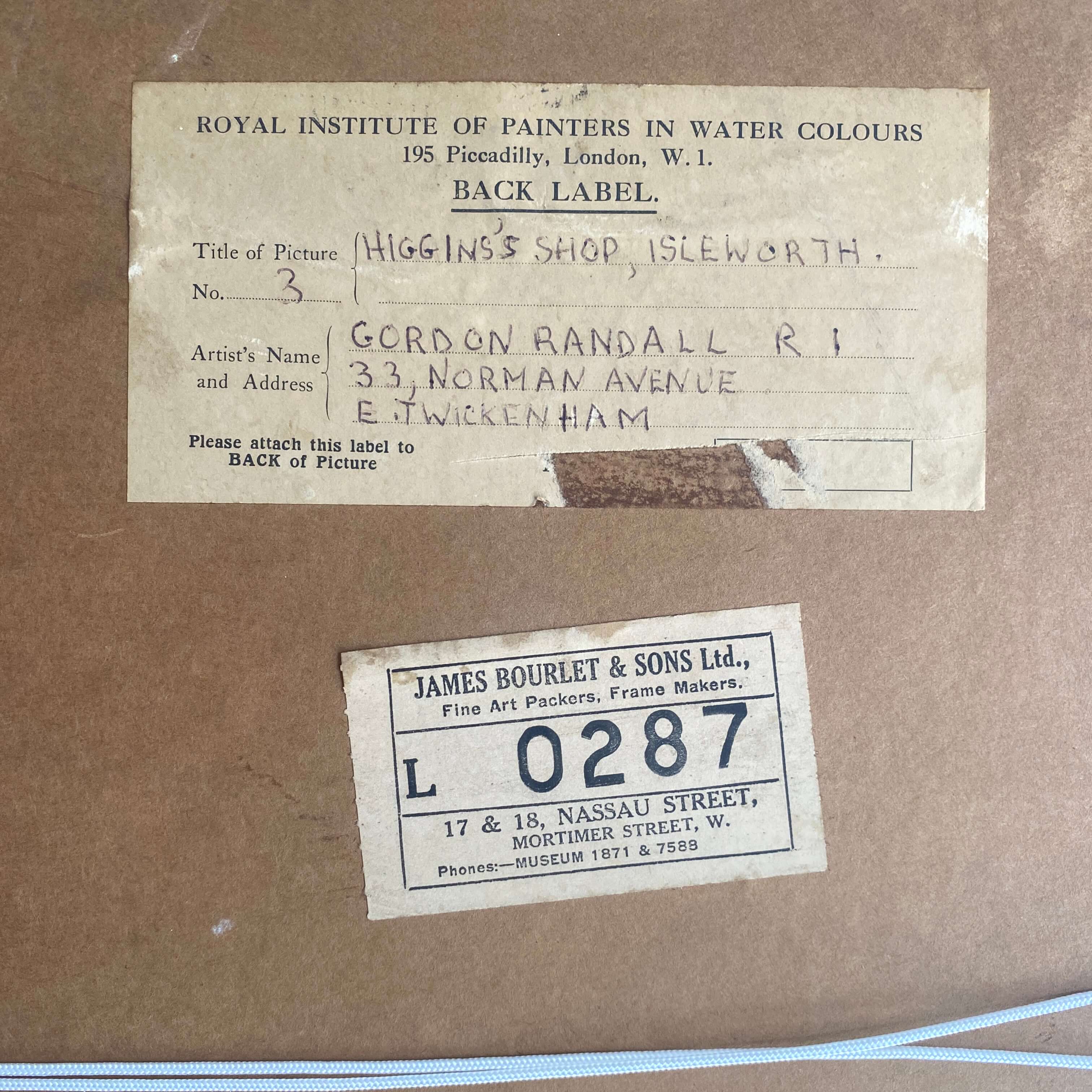 The watercolour is by Gordon Randall who was a member of the Royal Institute of Painters in Watercolour. The mount has been replaced but the glazed frame is original.